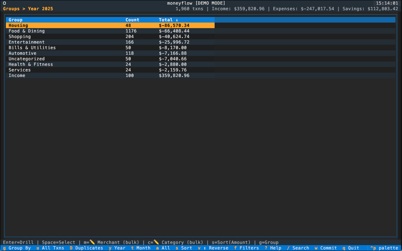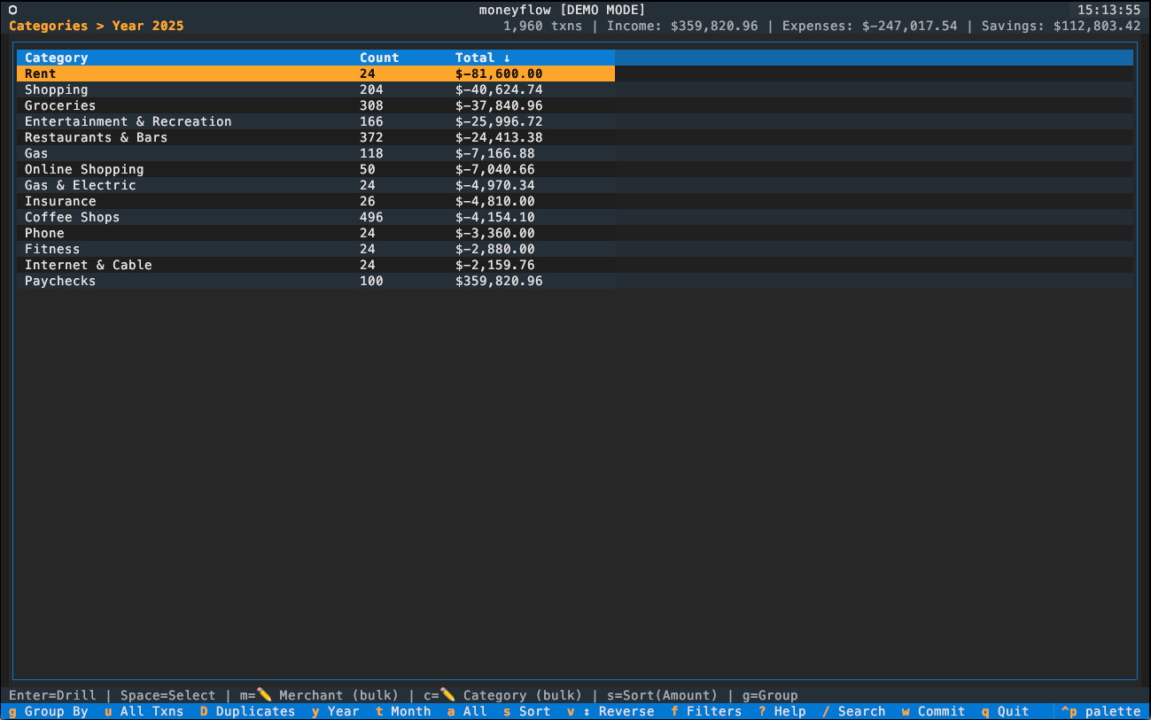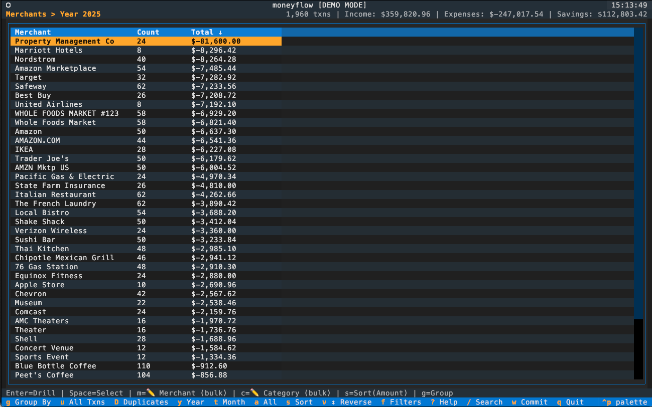- Combine drill-down with time navigation for powerful analysis: press t to filter to this month, drill down to analyze current spending, then press ← to compare with previous months