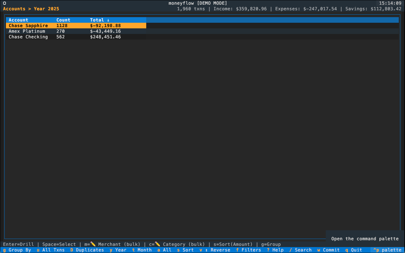 You can also specify time filters when launching moneyflow for faster startup with large transaction histories: